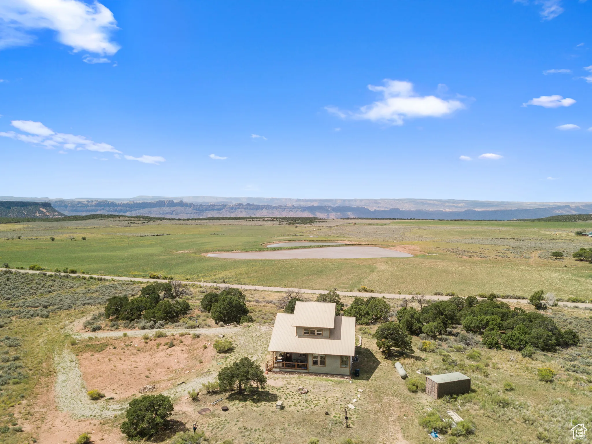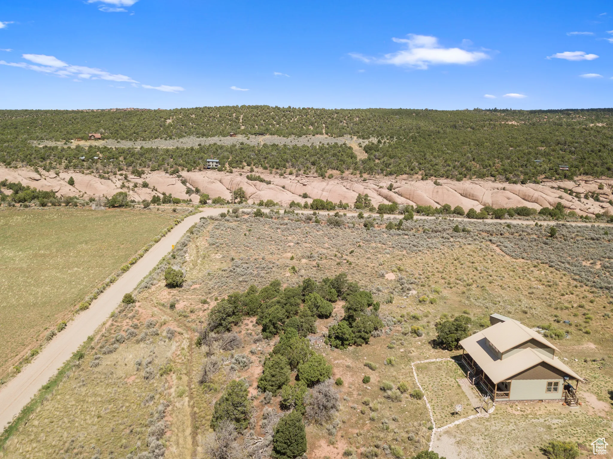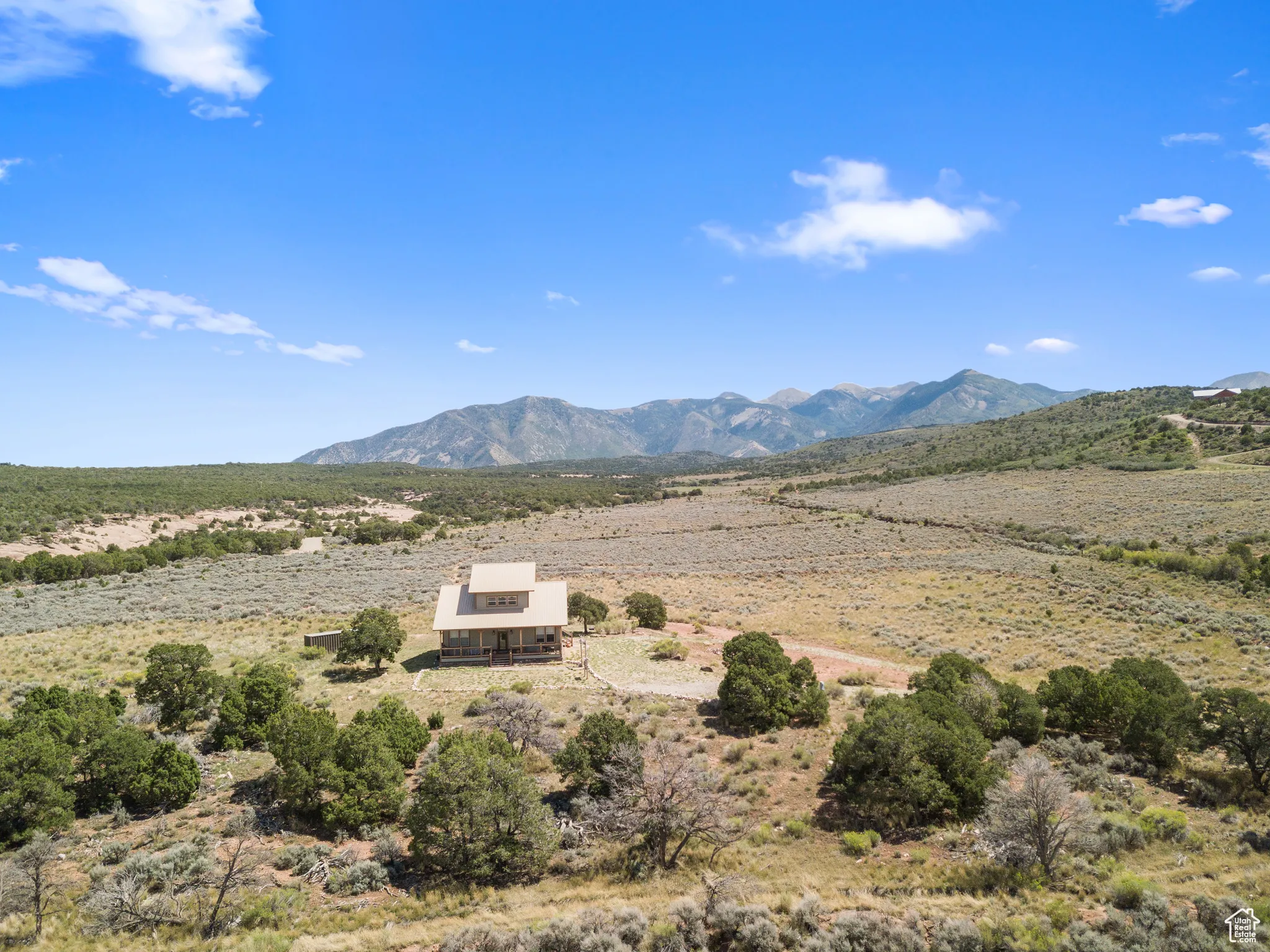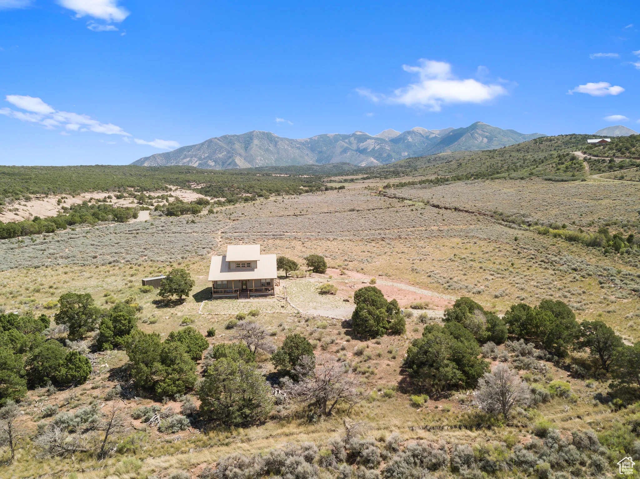 COUGAR CANYON- Experience solitude and grandiose beauty on 10 private acres perched above Mill Creek Canyon wilderness at the edge of Cougar Canyon, where rustic charm meets wild living with sweeping views of the La Sal Mountains, Moab Rim, Canyonlands and beyond from the top of Wilson Mesa-your very own piece of high-desert paradise. The quality-built, contemporary farmhouse has all the trappings of modern coziness and luxury; a large, east-facing deck to bask in the sunrise and a west-facing covered porch to relax as the sun sets. Offering three bedrooms and two and a half bathrooms, this furnished retreat is complete with the high-quality furniture included. On the main floor, the beautifully lit living area is inviting and hosts an enticing gas fireplace for ambiance and warmth during the chilly evenings. Also, on the main level is a gorgeous kitchen with granite countertops, all appliances and formal dining, a main bedroom suite with soaking tub and guest bedroom with separate bathroom. Upstairs, enjoy the fun and relaxing atmosphere for movies, or just sitting in the window nook taking in the view with one bedroom and a half bath. Outside, take advantage of the full RV hook-up, as well as a Conex storage container. This rare property is on a well with sweet mountain water, is attached to grid power, has a septic system in place, and fiber optic connectivity. Enjoy vast amounts of open space, as this property also includes a 20% interest in over 250 acres of community ranch land. This private retreat is your Moab Desert and La Sal Mountain recreational paradise! Square footage figures are provided as a courtesy estimate only and were obtained from images. Buyer is advised to obtain an independent measurement.