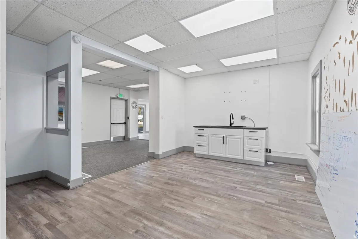Located in a prime Roy location on 1900, backed up to I-15, this 0.36-acre commercial property is zoned DT-G, offering mixed-use potential with commercial required on the main level and options for residential or additional commercial space upstairs. The main level includes a showroom/front area with potential for additional office space, a private office, a bathroom, and a sink/storage area. Upstairs features two office spaces with mini-split systems for heating and cooling, easily convertible to three offices, and a separate rear entrance for convenience. The south door patio leads to a basement with ample storage. Additional features include a Clover 8-camera system, sprinkler system, 18 parking stalls, and Gemstone lighting for curb appeal and security. With 37,000 vehicles passing daily on I-15 and 8,000 on 1900, this property offers unbeatable business exposure.
