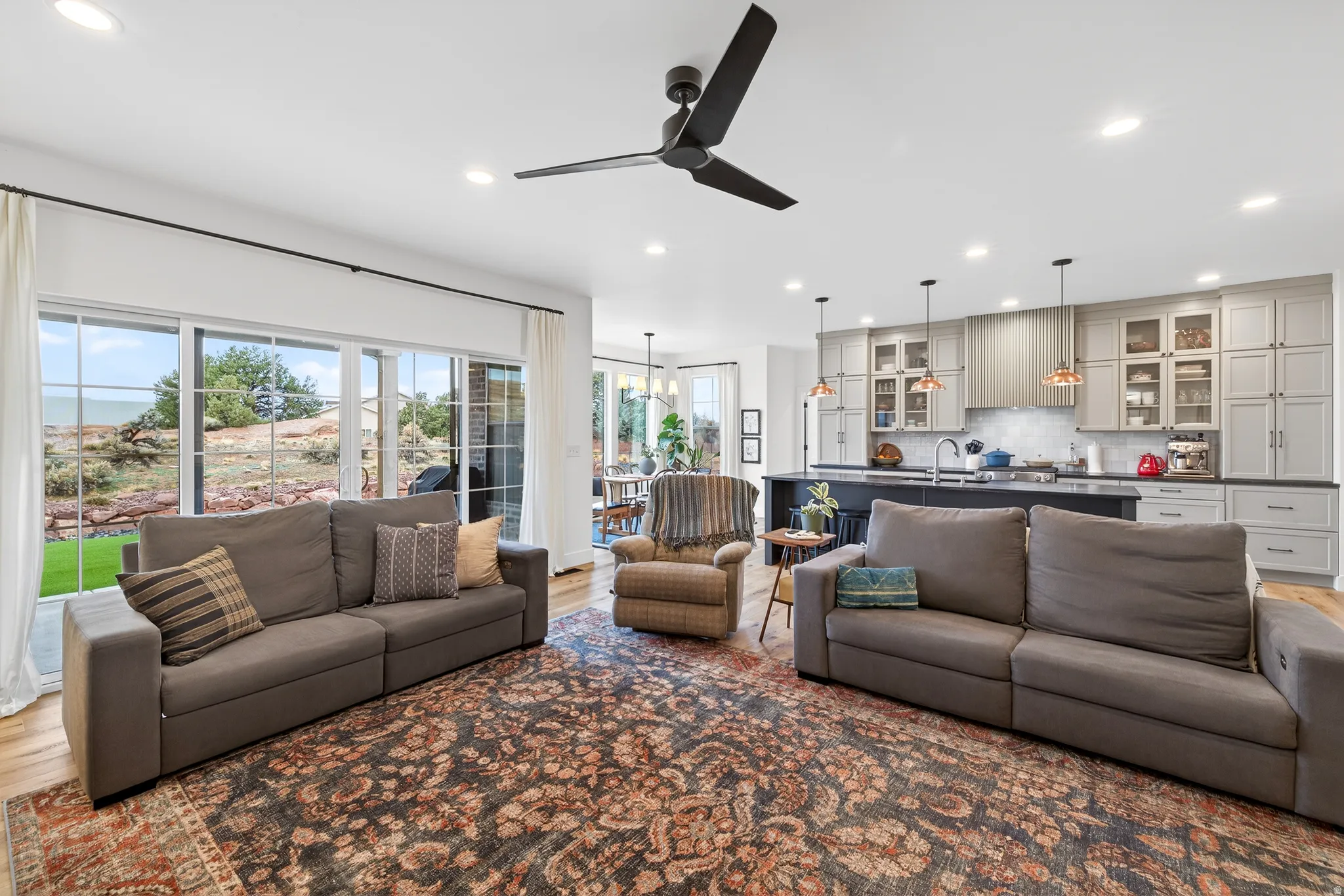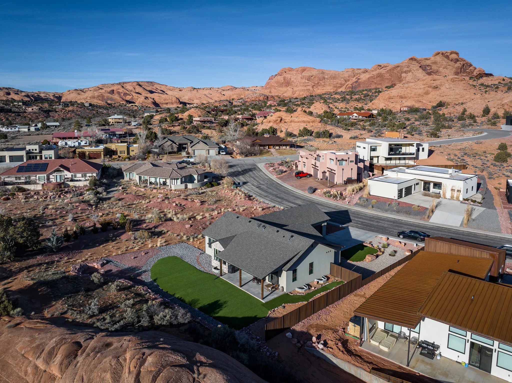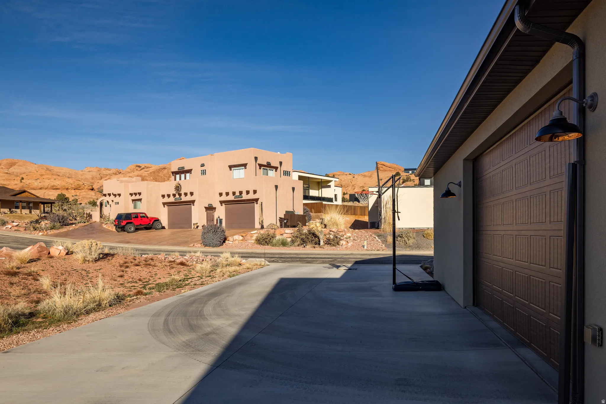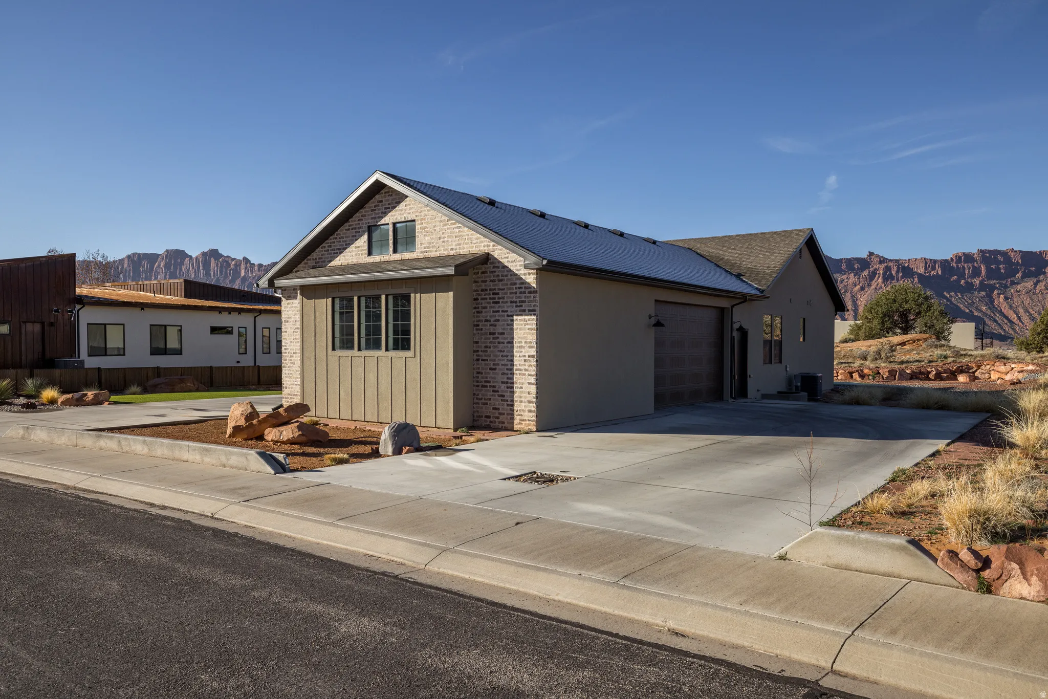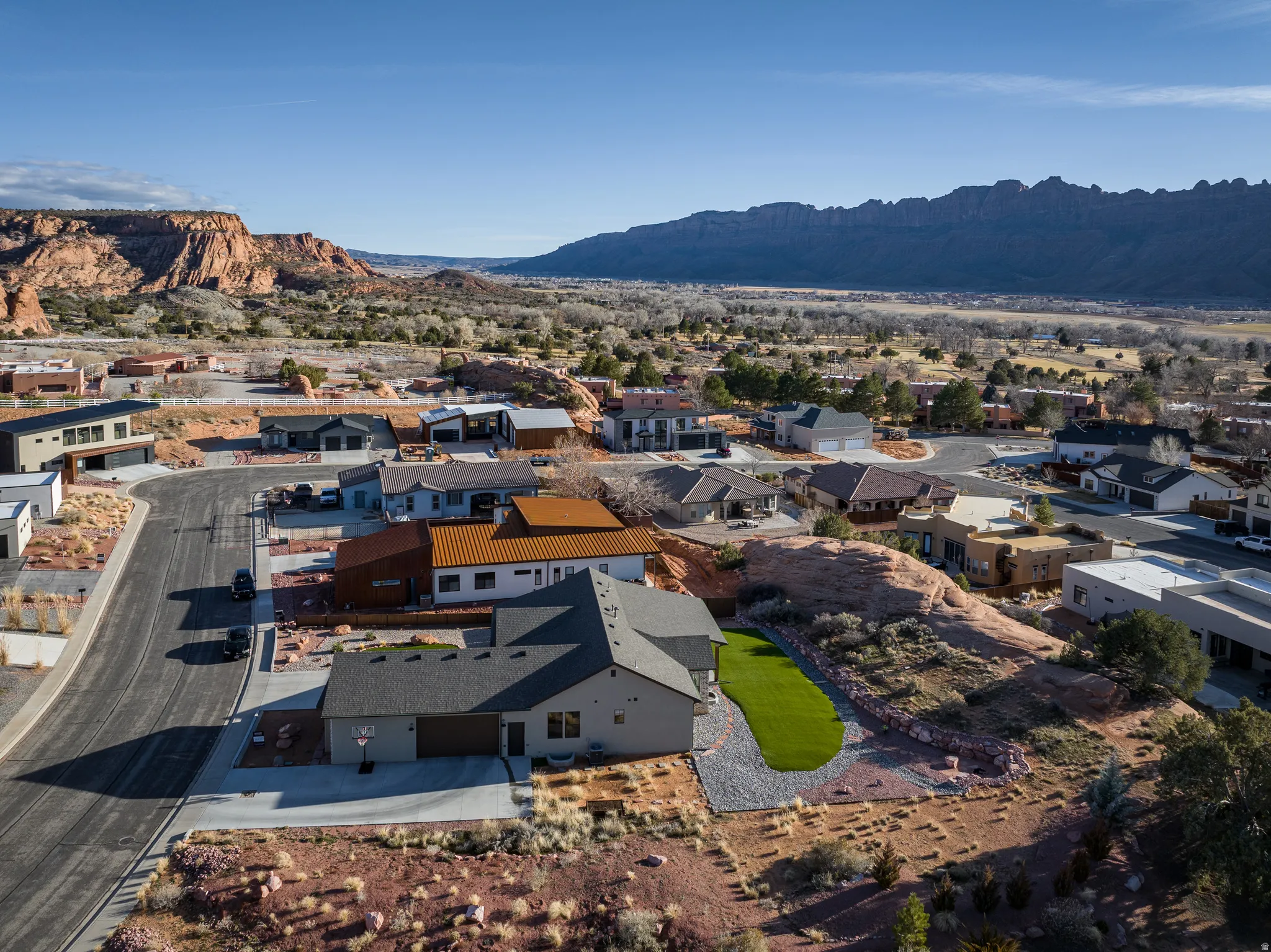 Stunning Custom Home in Coveted Puesta del Sol! Step into a world of thoughtful design and sophisticated comfort in this exceptional 5-bedroom, 3.5-bath home set on nearly 0.4 acres of low-maintenance xeriscaped grounds, offering your own private piece of iconic red rock. From the moment you enter the welcoming foyer, this home balances elegance and functionality with seamless flow and abundant natural light. Curved doorways, expansive windows, and carefully considered architectural details create a sense of refinement throughout. The heart of the home is a light-filled living room, perfect for both everyday living and entertaining. A glassed-in dining area with panoramic views complements the gourmet kitchen, complete with stainless steel appliances, an oversized breakfast bar seating five, plentiful cabinetry, and a large pantry. The gas fireplace adds warmth and ambiance, while the adjacent mudroom and dedicated laundry with ample storage ensure practicality meets style. The main floor primary suite is a private retreat, featuring a luxurious ensuite with dual vanities, a gorgeous tile shower, and a massive walk-in closet with built-in shelving and drawers. Step through the sliding glass doors to your patio, where red rock vistas become part of your everyday backdrop. On the opposite side of the home, two additional bedrooms and a shared full bath provide comfort and privacy for family or guests. The lower level expands your living and entertaining options with two more bedrooms, a full bath, and a sprawling recreation room that invites movie nights, game days, or large gatherings. A drive-through garage adds convenience, while the exterior spaces offer a simple, serene environment designed for ease of living. Every element of this home has been carefully considered, from architectural curves and natural light to functional spaces that enhance daily life. Whether entertaining, relaxing, or enjoying the landscape, this home delivers an unparalleled blend of elegance, comfort, and versatility in one of Moab’s most sought-after neighborhoods.