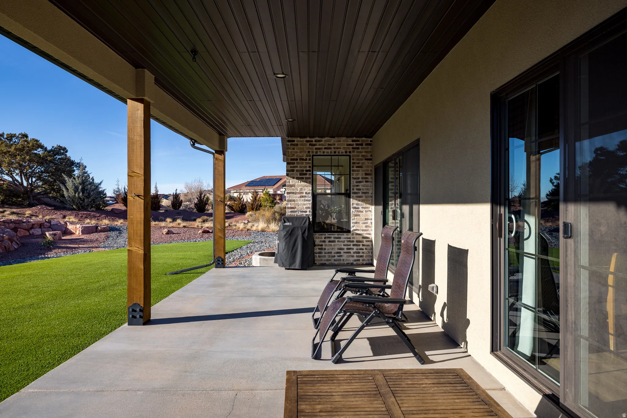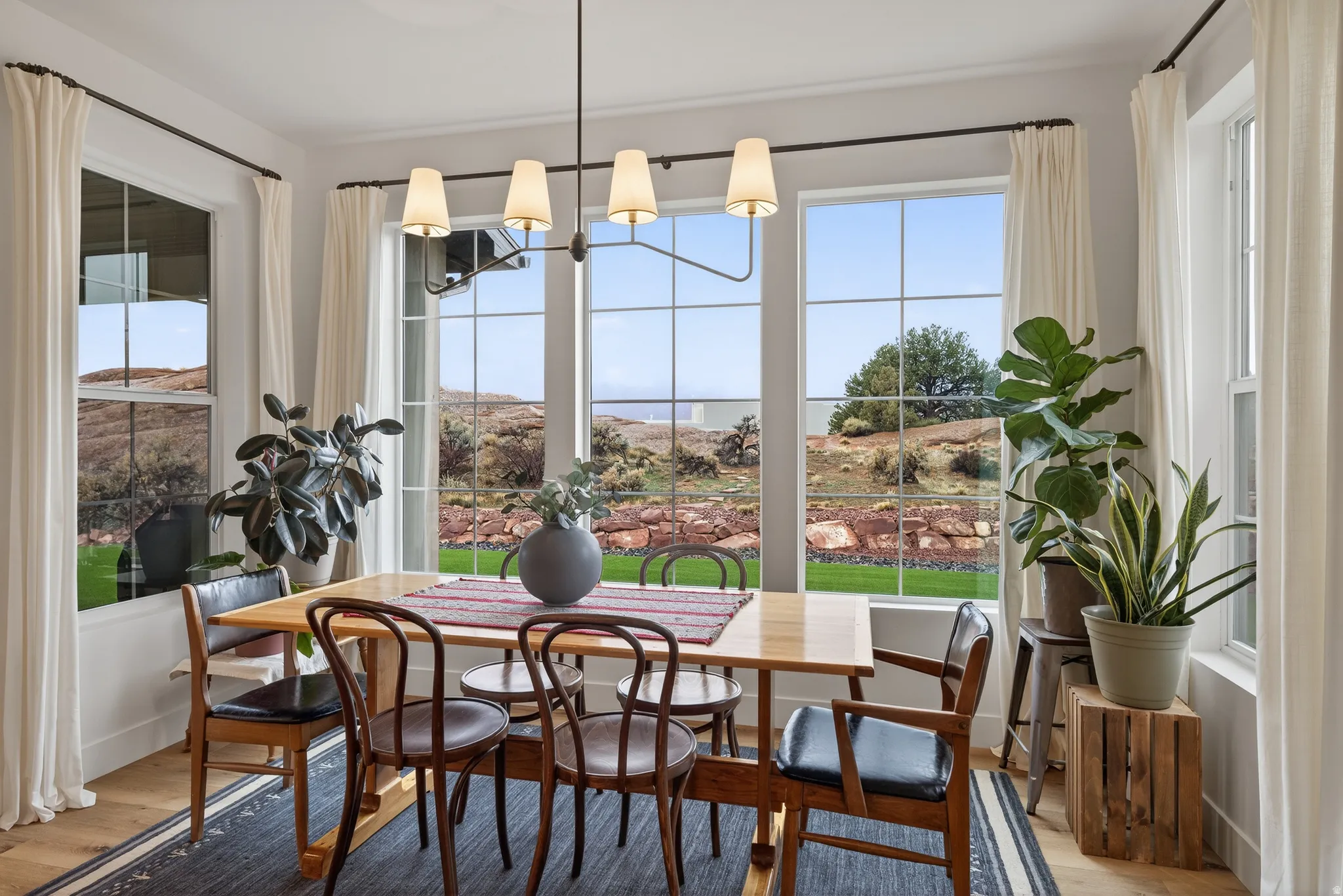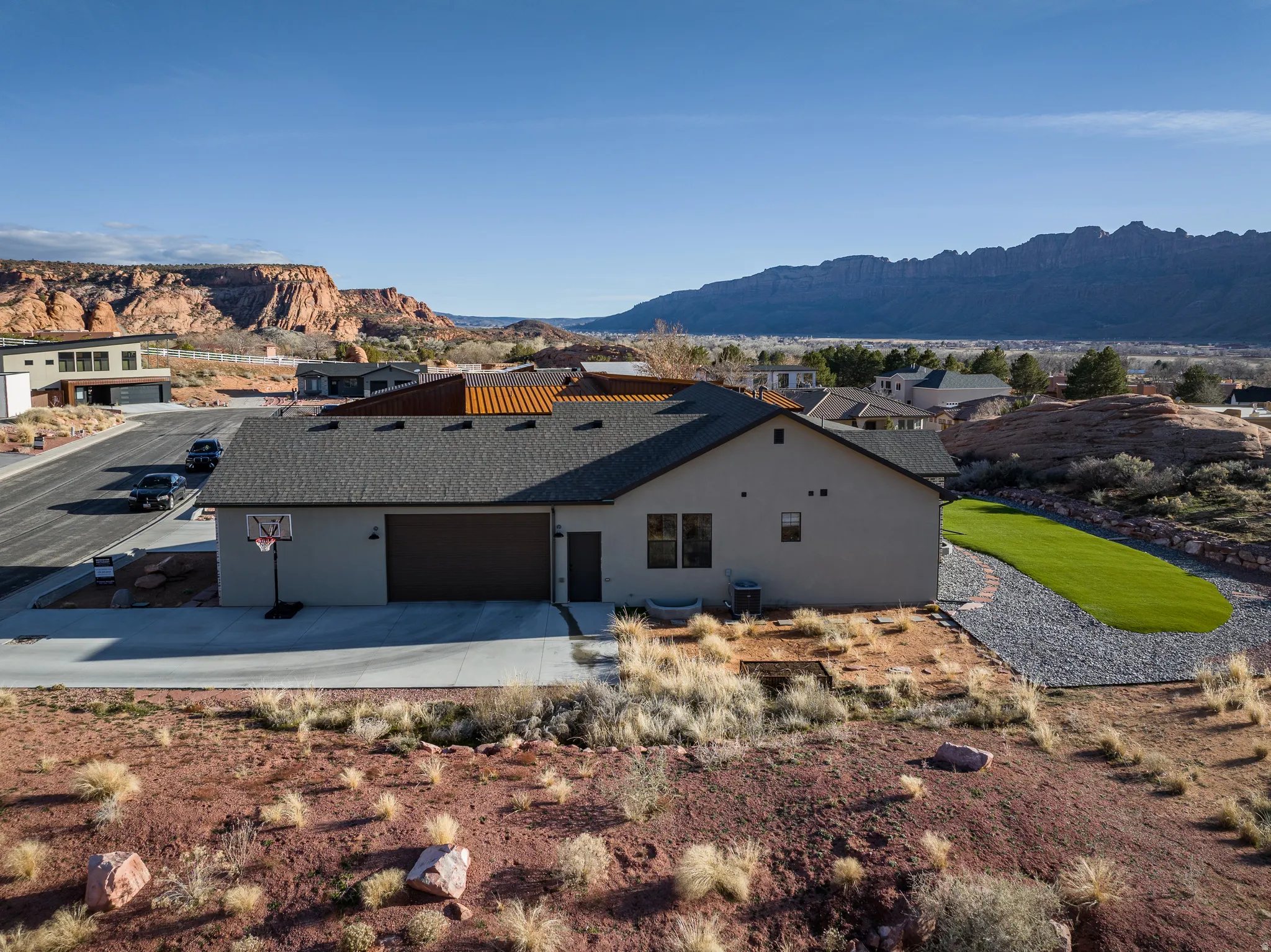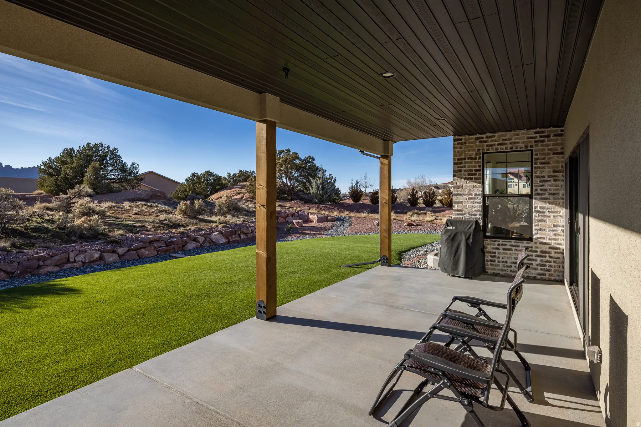 Stunning Custom Home in Coveted Puesta del Sol! Step into a world of thoughtful design and sophisticated comfort in this exceptional 5-bedroom, 3.5-bath home set on nearly 0.4 acres of low-maintenance xeriscaped grounds, offering your own private piece of iconic red rock. From the moment you enter the welcoming foyer, this home balances elegance and functionality with seamless flow and abundant natural light. Curved doorways, expansive windows, and carefully considered architectural details create a sense of refinement throughout. The heart of the home is a light-filled living room, perfect for both everyday living and entertaining. A glassed-in dining area with panoramic views complements the gourmet kitchen, complete with stainless steel appliances, an oversized breakfast bar seating five, plentiful cabinetry, and a large pantry. The gas fireplace adds warmth and ambiance, while the adjacent mudroom and dedicated laundry with ample storage ensure practicality meets style. The main floor primary suite is a private retreat, featuring a luxurious ensuite with dual vanities, a gorgeous tile shower, and a massive walk-in closet with built-in shelving and drawers. Step through the sliding glass doors to your patio, where red rock vistas become part of your everyday backdrop. On the opposite side of the home, two additional bedrooms and a shared full bath provide comfort and privacy for family or guests. The lower level expands your living and entertaining options with two more bedrooms, a full bath, and a sprawling recreation room that invites movie nights, game days, or large gatherings. A drive-through garage adds convenience, while the exterior spaces offer a simple, serene environment designed for ease of living. Every element of this home has been carefully considered, from architectural curves and natural light to functional spaces that enhance daily life. Whether entertaining, relaxing, or enjoying the landscape, this home delivers an unparalleled blend of elegance, comfort, and versatility in one of Moab’s most sought-after neighborhoods.