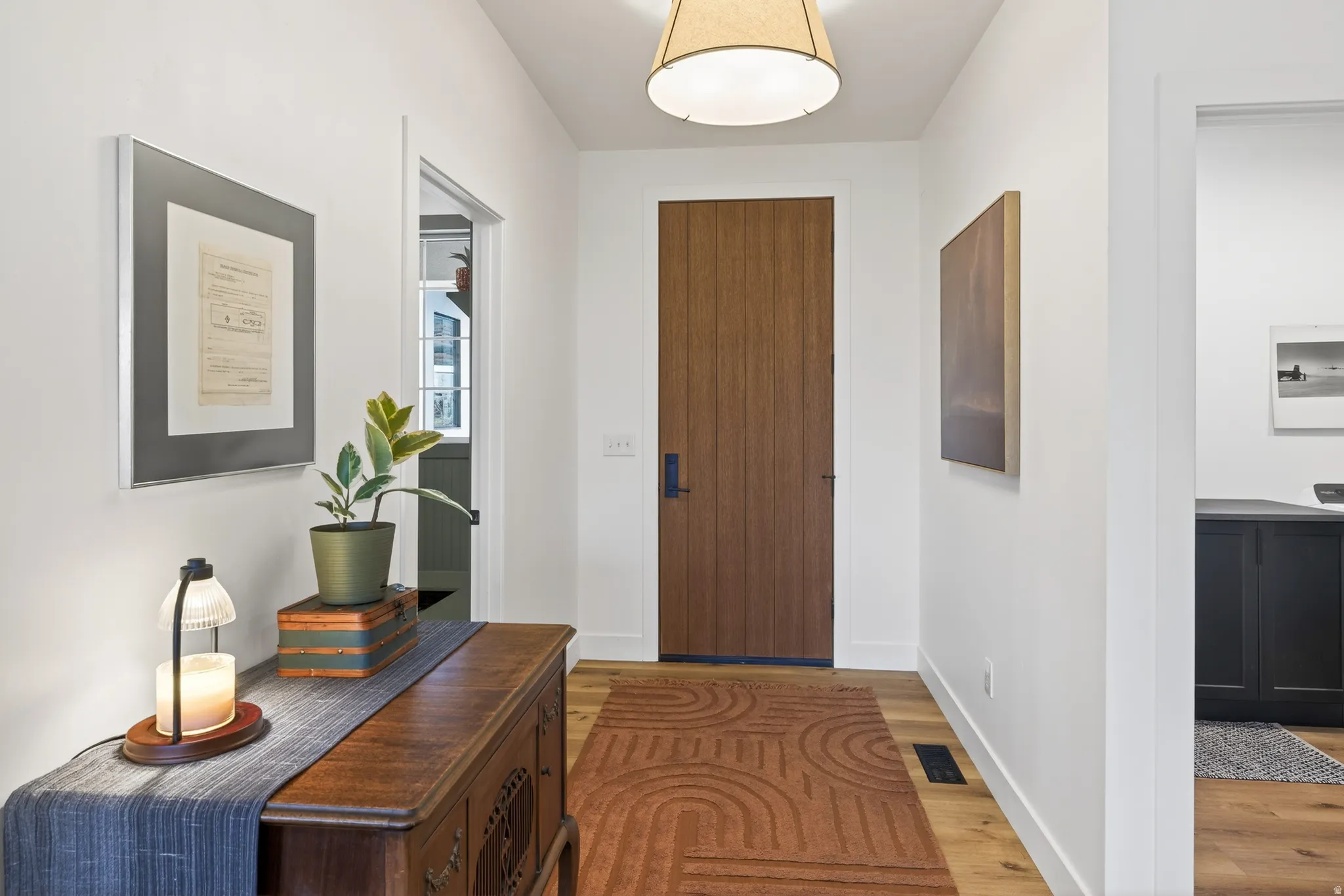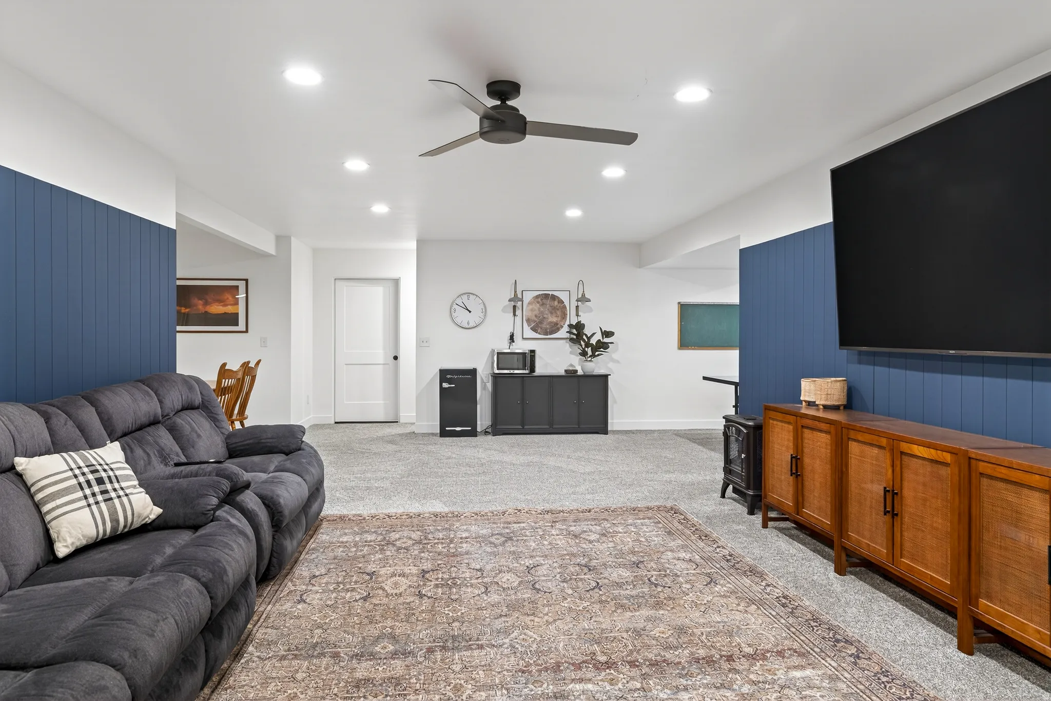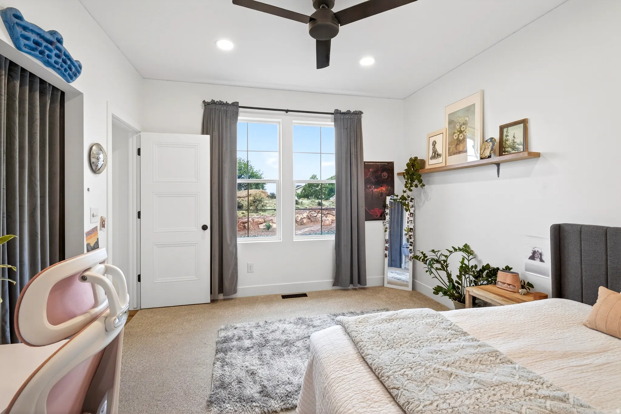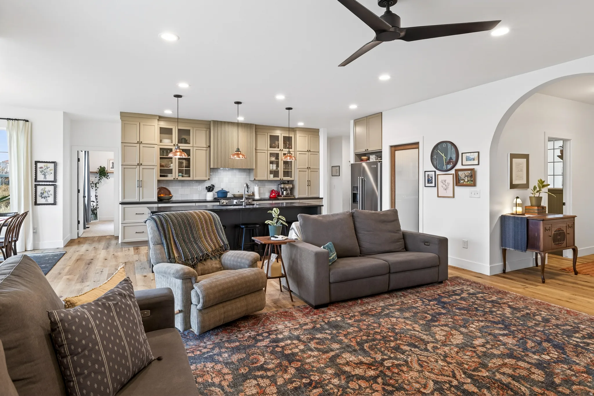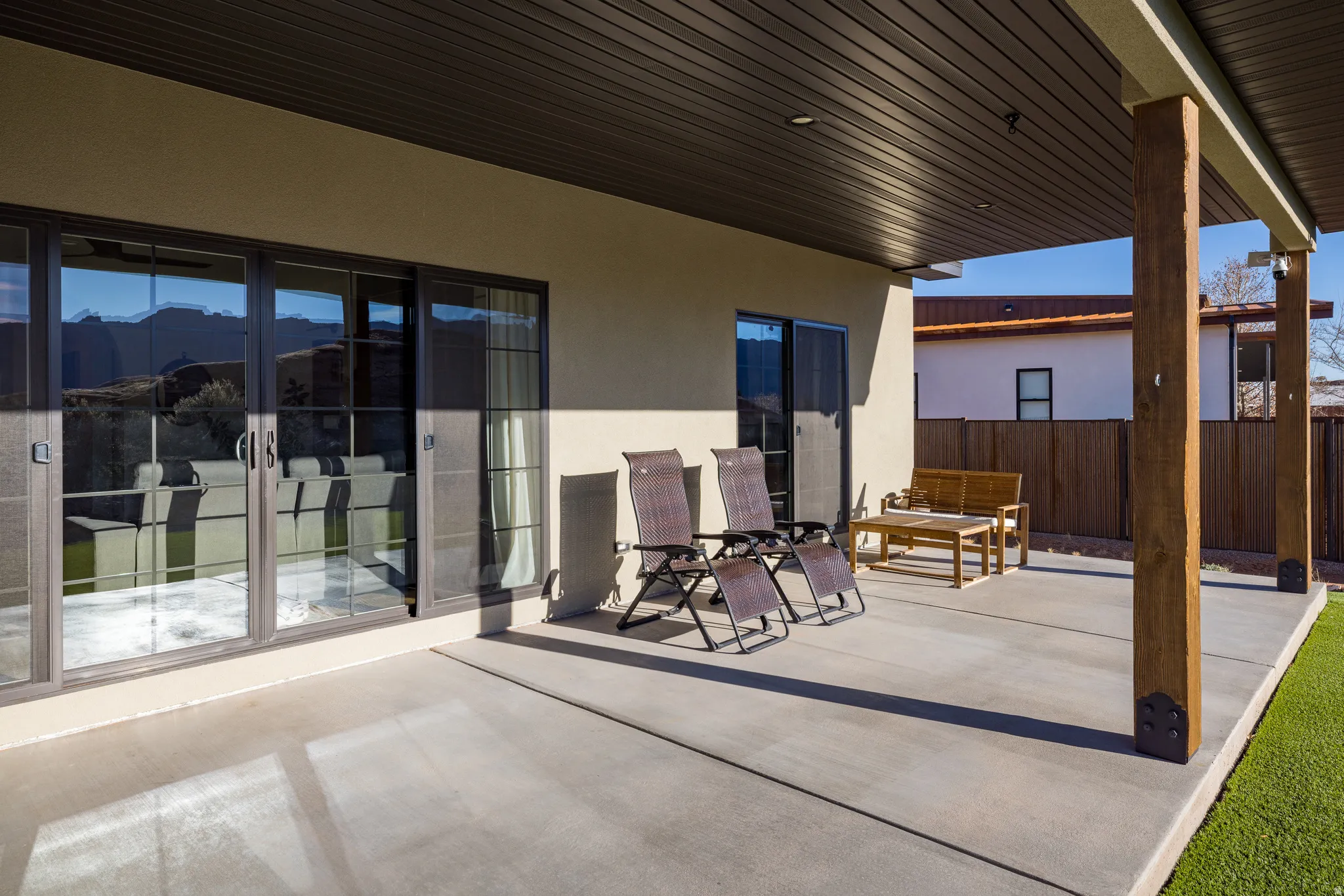 Stunning Custom Home in Coveted Puesta del Sol! Step into a world of thoughtful design and sophisticated comfort in this exceptional 5-bedroom, 3.5-bath home set on nearly 0.4 acres of low-maintenance xeriscaped grounds, offering your own private piece of iconic red rock. From the moment you enter the welcoming foyer, this home balances elegance and functionality with seamless flow and abundant natural light. Curved doorways, expansive windows, and carefully considered architectural details create a sense of refinement throughout. The heart of the home is a light-filled living room, perfect for both everyday living and entertaining. A glassed-in dining area with panoramic views complements the gourmet kitchen, complete with stainless steel appliances, an oversized breakfast bar seating five, plentiful cabinetry, and a large pantry. The gas fireplace adds warmth and ambiance, while the adjacent mudroom and dedicated laundry with ample storage ensure practicality meets style. The main floor primary suite is a private retreat, featuring a luxurious ensuite with dual vanities, a gorgeous tile shower, and a massive walk-in closet with built-in shelving and drawers. Step through the sliding glass doors to your patio, where red rock vistas become part of your everyday backdrop. On the opposite side of the home, two additional bedrooms and a shared full bath provide comfort and privacy for family or guests. The lower level expands your living and entertaining options with two more bedrooms, a full bath, and a sprawling recreation room that invites movie nights, game days, or large gatherings. A drive-through garage adds convenience, while the exterior spaces offer a simple, serene environment designed for ease of living. Every element of this home has been carefully considered, from architectural curves and natural light to functional spaces that enhance daily life. Whether entertaining, relaxing, or enjoying the landscape, this home delivers an unparalleled blend of elegance, comfort, and versatility in one of Moab’s most sought-after neighborhoods.