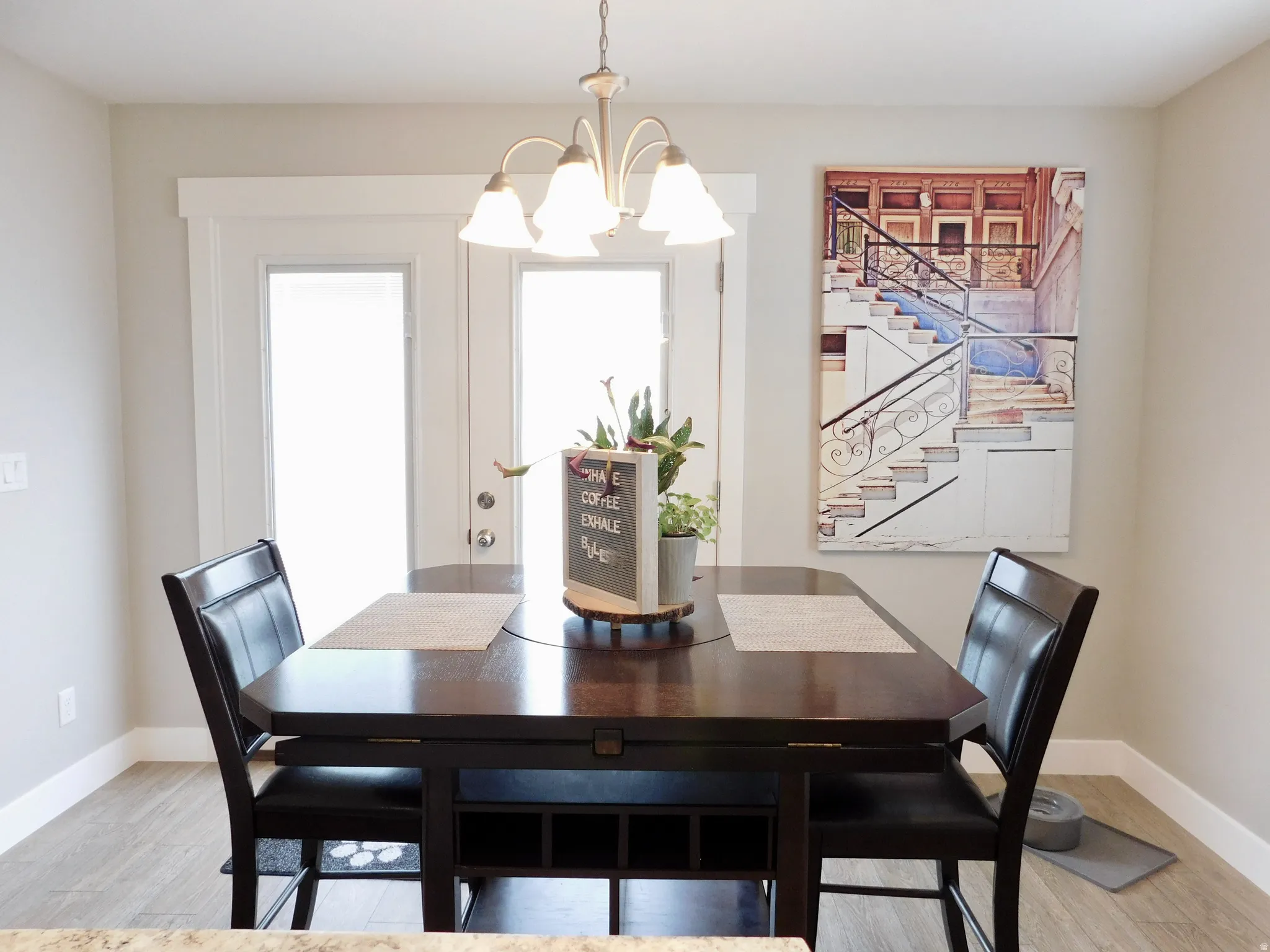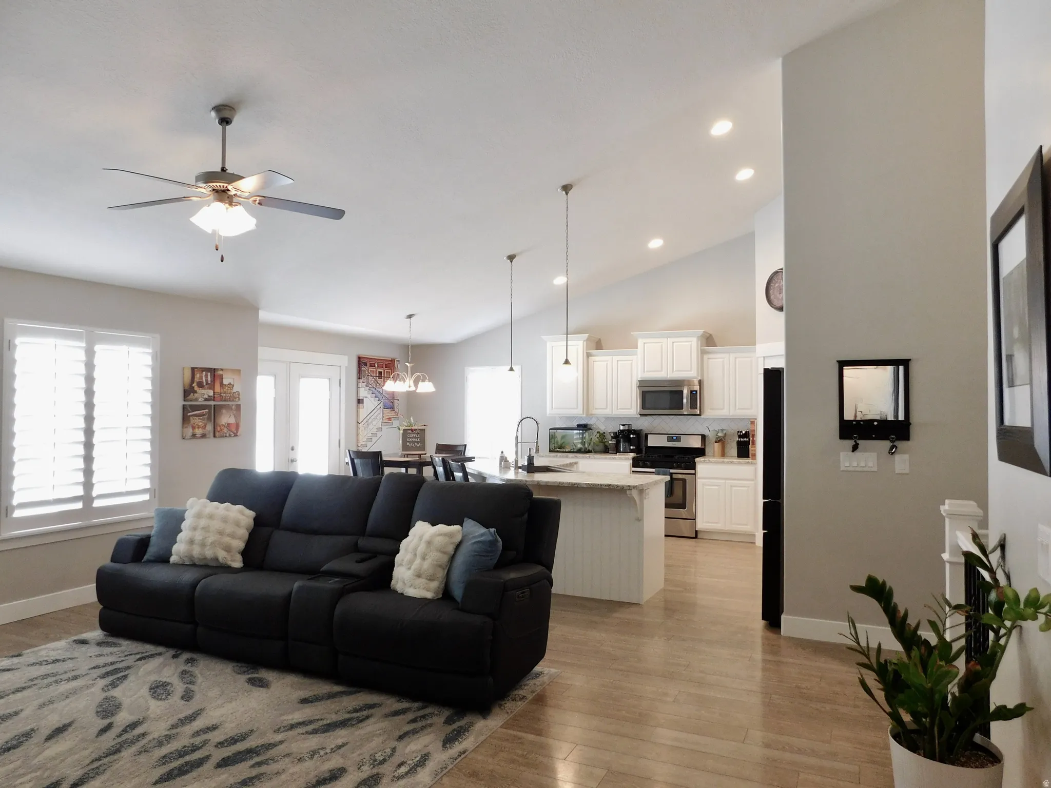 Beautiful rambler-style home offering 3,114 sq ft, 5 bedrooms, and 3 bathrooms with comfortable main-level living and a spacious open layout. The home features vaulted ceilings, waterproof LVP flooring, and a stunning kitchen with a large island bar, white staggered and stacked cabinetry, and plenty of space for gathering and entertaining. The primary suite is generously sized and includes an ensuite bath with dual vanity sinks and walk-in closet. Downstairs, the expansive walk-out basement provides incredible flexibility with plenty of space for a future full kitchen or wet bar, making it ideal for entertaining, guests, or multi-generational living. Step outside to an intimate, low-maintenance backyard featuring an extended patio and decorative lighting, perfect for relaxing or hosting friends and family. The home is clean, well-maintained, and located in a community with a low HOA and permitted off-street parking.