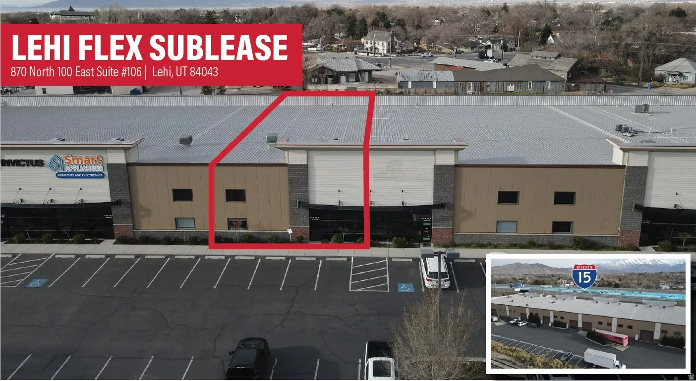 Total Available: 7,000 SF – 1,000 SF Office – 1,000 SF Mezzanine – 5,000 SF Warehouse Loading: – One 14’x14′ GL Door – Shared Exterior Loading Dock 15′-20′ Clear Height Temperature Controlled Warehouse LED Warehouse Lighting Fire Suppression System Master Lease Expiration: November 30, 2028 Zoning: Mixed Use Free Span Warehouse Freeway Frontage Access: Easy Access to I-15 Location: Located in the Highly Desirable Submarket of Lehi With Easy Access From State Street