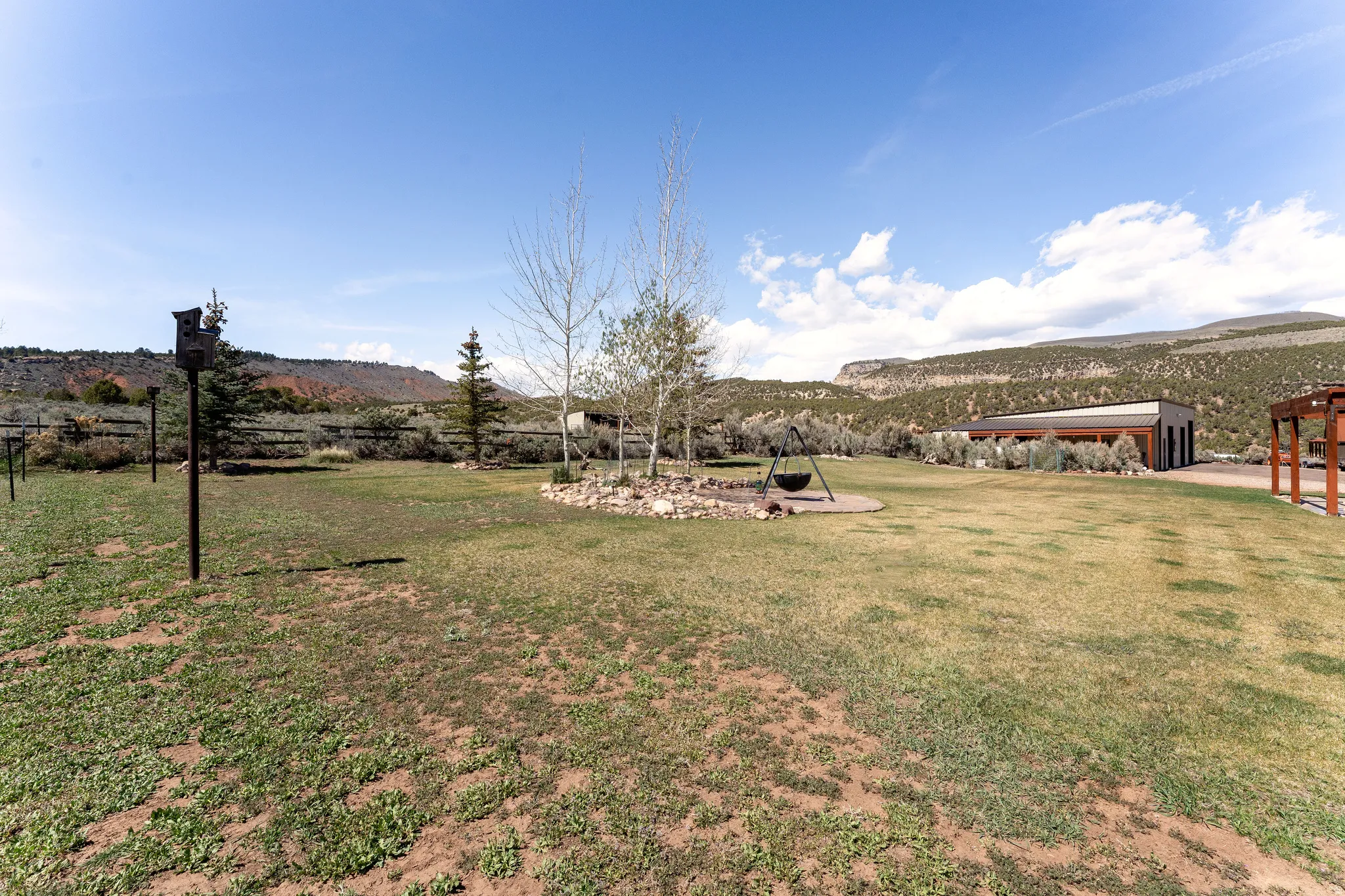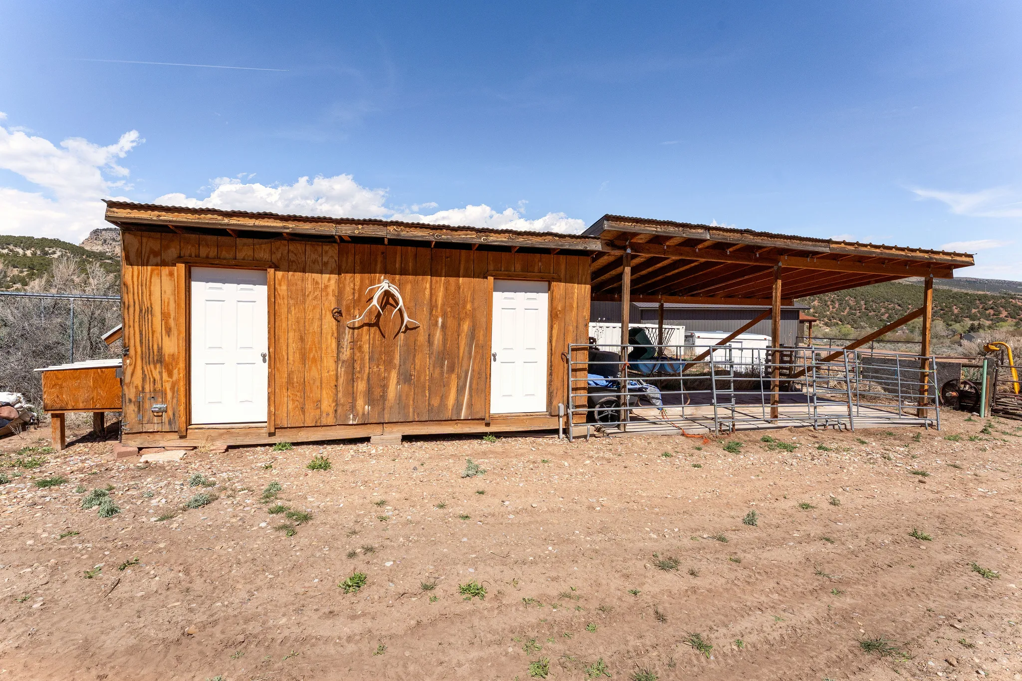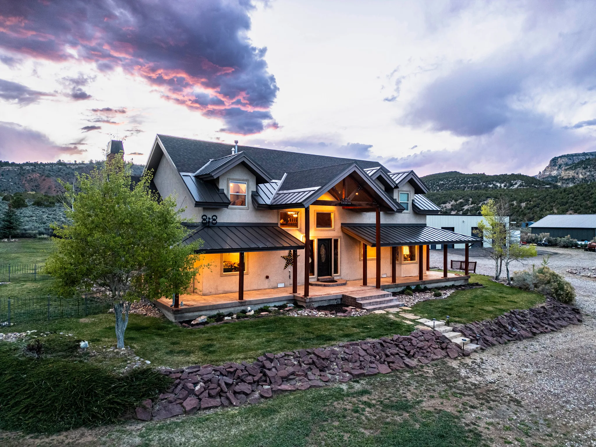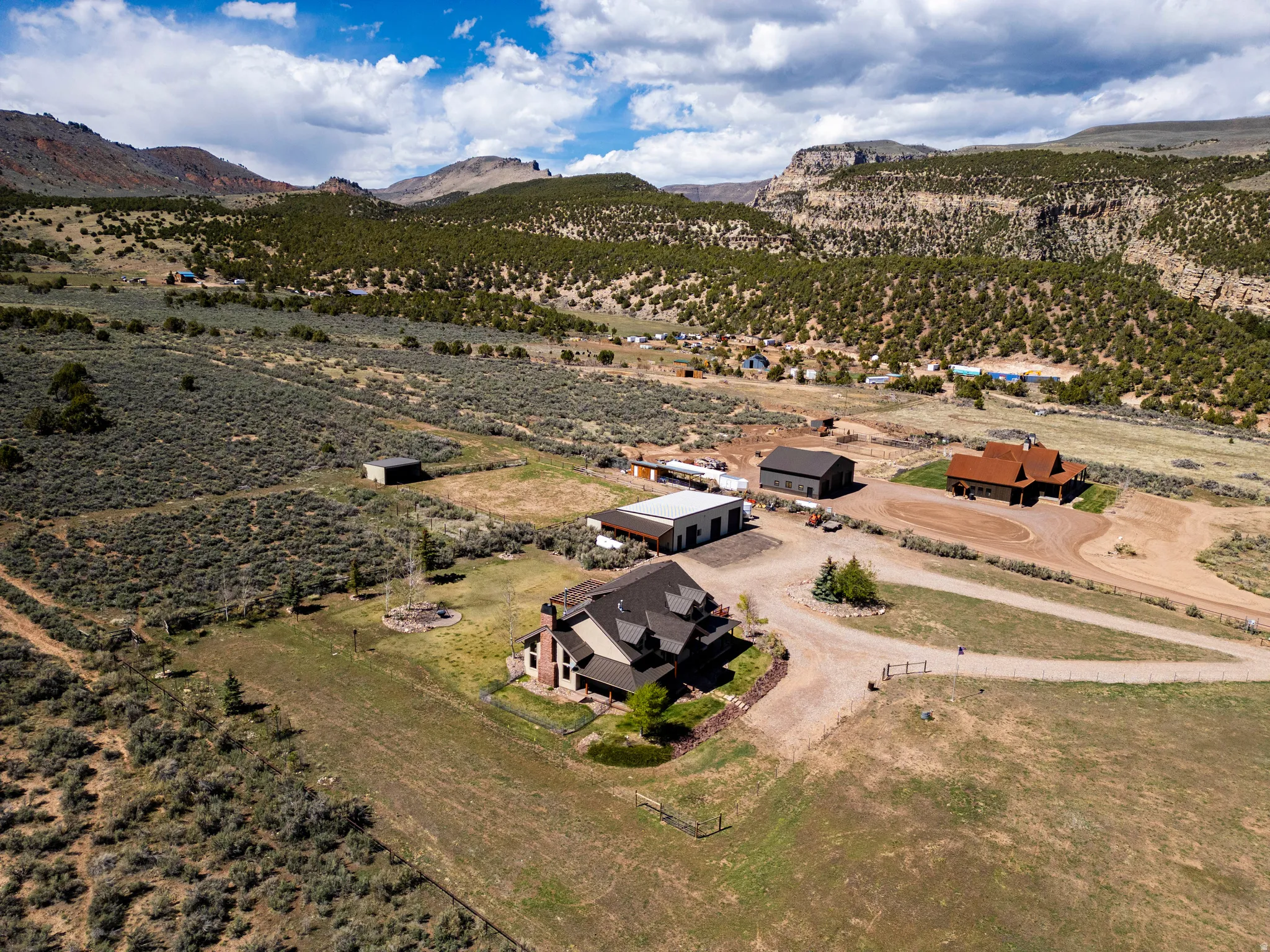 Tucked into the heart of Dry Fork Canyon, this remarkable 8-acre estate offers more than a home-it delivers a lifestyle surrounded by some of Vernal’s most iconic scenery. Towering Navajo sandstone cliffs create a dramatic backdrop, while nearby access to McConkie Ranch Petroglyphs, the Flume and Narrow trailheads, Red Cloud Loop, Flaming Gorge, Red Fleet Reservoir & Ashley Gorge via Ferrata puts outdoor adventure close by. A covered wrap-around porch welcomes you into a thoughtfully designed residence where craftsmanship and comfort meet. Inside, the great room makes an unforgettable first impression with soaring 24-foot tongue-and-groove vaulted ceilings, expansive wood-framed windows, and a striking floor-to-ceiling stone fireplace, complemented by a Blaze King wood catalytic stove. Natural light and panoramic canyon views fill the space, creating a true sense of mountain elegance. The kitchen serves as the heart of the home, featuring granite and quartz countertops, custom alder cabinetry with built-in details, a gas range, and a new updated refrigerator. Whether gathered at the breakfast bar or seated in the charming circular dining nook, every space is designed to take in the surrounding views. The main-level primary suite offers a peaceful retreat, complete with a spa-inspired bathroom featuring a freestanding soaking tub, walk-in shower, and walk-in closet. With four bedrooms and two-and-a-half bathrooms, the home balances comfortable private spaces with inviting areas for entertaining. Designed with both function and versatility in mind, the property is fully equipped for animals and hobbies alike. Much of the acreage is pipe-fenced, with established pasture on the front and south side, and a fully fenced back area that includes a 20′ x 24′ lean-to. The impressive 3,500 sq. ft. red iron shop with attached lean-to provides exceptional workspace, featuring five bay doors, 200-amp separate service, commercial-grade wiring, a 50-amp RV hookup, and dedicated areas for storage, projects, and even a custom sauna. Outdoor living is just as exceptional, with a stamped patio, pergola, and custom rock firepit area perfect for enjoying peaceful canyon evenings. Additional amenities include a high-fenced garden, chicken coop with run, covered hay storage, multiple water hydrants, and ample storage throughout. The property is also supported by 1,000-gallon and 500-gallon propane tanks for added convenience. This is a rare opportunity to own a private canyon retreat that seamlessly blends refined living with the rugged beauty of the surrounding landscape. Buyer to verify all information, including square footage.