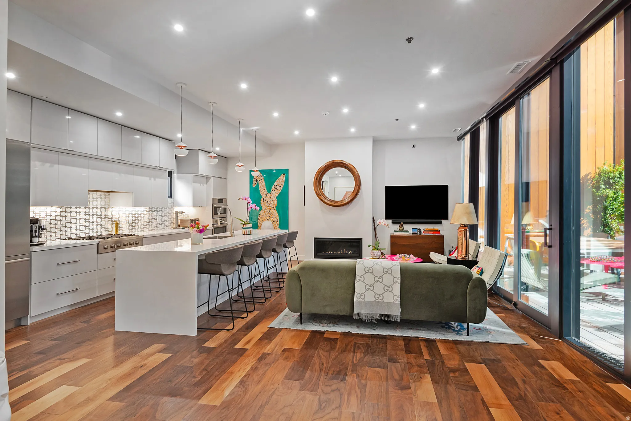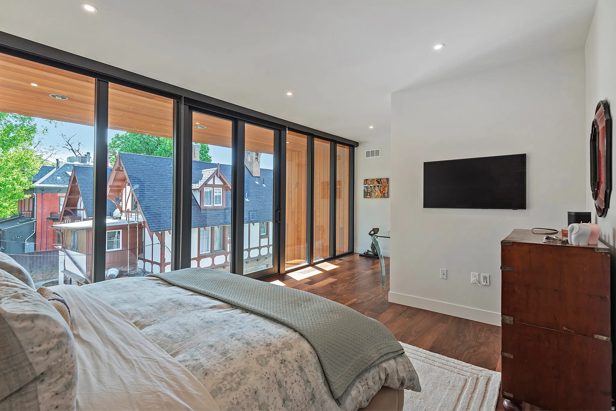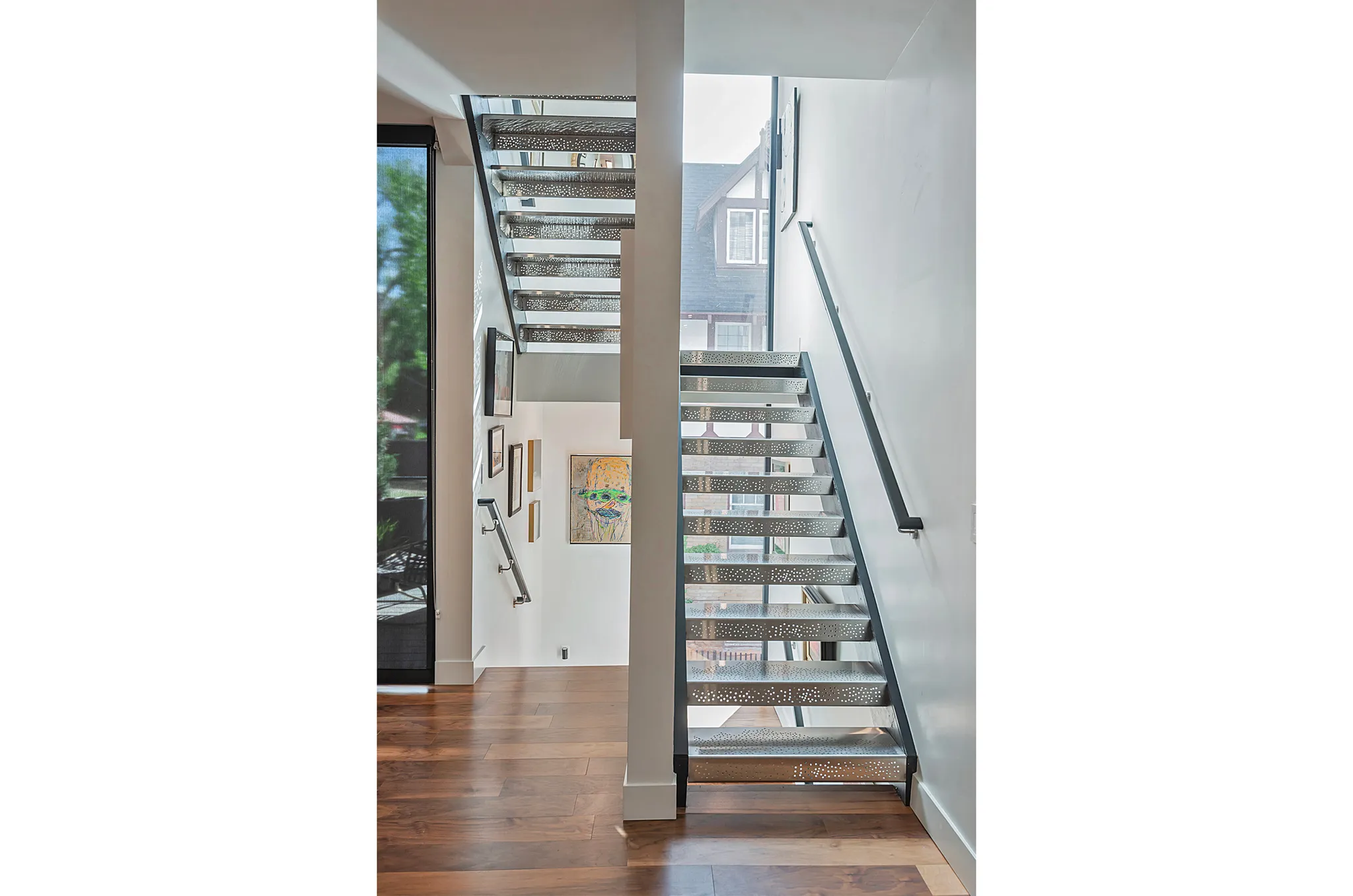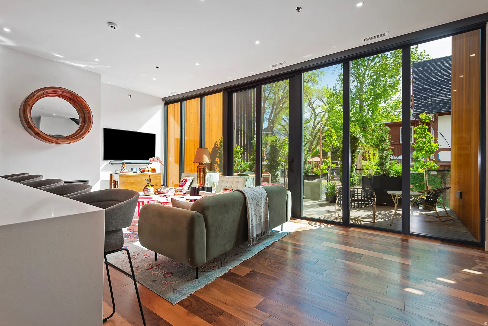 Modern luxury townhome set along the iconic Historic South Temple, offering a blend of architectural design and urban living just minutes from the University of Utah, downtown, shopping, and fine dining. Built to commercial standards, the residence is defined by expansive floor-to-ceiling Windsor windows that flood the home with natural light, engineered walnut flooring, and a thoughtfully designed open layout. A true statement piece, the custom 16-gauge stainless steel floating staircase features a perforated design inspired by the Wasatch Mountains. The chef’s kitchen is appointed with a premium Bosch appliance package, commercial-grade Mirlux high-gloss cabinetry, quartz countertops, and a marble and stainless-steel patterned backsplash. Floor-to-ceiling glass doors extend the living space to a private 163 sq ft deck, wrapped in cedar for a warm, modern contrast. The upper level offers a well-appointed primary suite, secondary bedroom, and full bath. The crowning feature is the expansive rooftop deck, featuring over 590 sq ft of elevated outdoor living space designed for both relaxation and entertaining, complete with Trex decking, turf, and a steel pergola. All while offering sweeping mountain, capitol, valley, and sunset views. Additional high-end features include a Lutron lighting system, brand-new high-efficiency HVAC, an in-line water heater, enhanced sound insulation with 16″ partition walls between units, and a garage wired for electric vehicles.